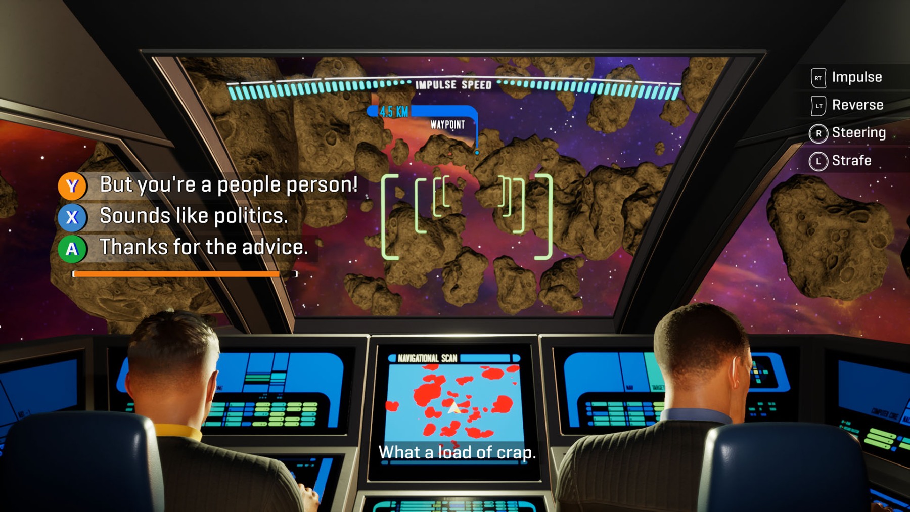 While the characters in the game are fixed and created, you do get a ton of control over how they interact with the story and other characters.  While my Carter was a caring and empathetic soul, my Jara was ambitious, brash and sometimes, overbearing.  I love a game that lets you take a character and build them through choice as to how you feel they should react.  The character choices give you so much nuance, down to creating your own executive code (can’t tell you mine, you might try to blow up my ship!), down to how you call for warp (I went with the assertive, “Do It!”).  And yes, you will have a story reason to take over the ship and it is pretty dang good to have responsibility for the entire crew of the Resolute.